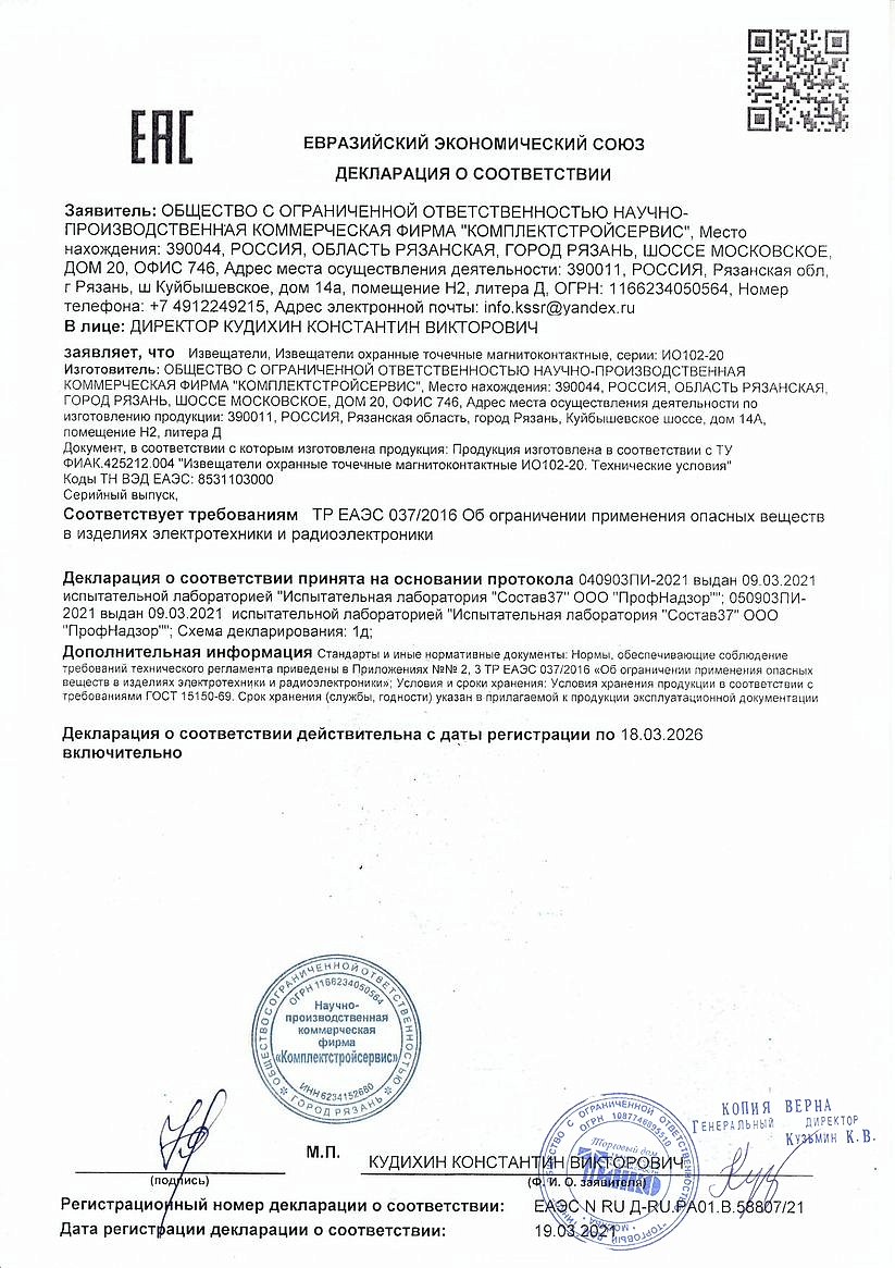 Магнитоконтактный для металлических поверхностей; контакты размыкаются при тревоге, 30 мм (контакты замкнуты), 65 мм (контакты разомкнуты); U-коммут.50 В, I-коммут.50 мА, P-коммут.10 Вт; IP44, t-раб.-50…+50°С, 53х30х30 мм (геркон и магнит). Кабель в металлорукаве 600 мм. Пластиковый корпус. 0.155 кг