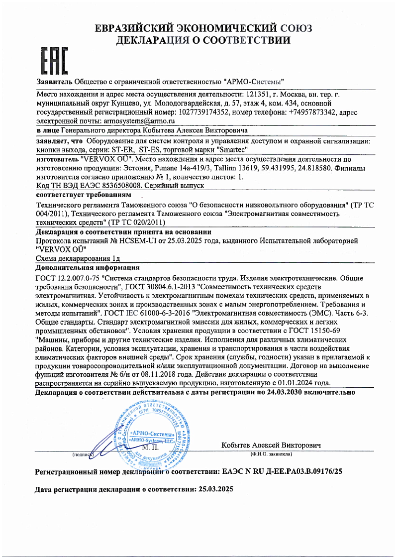 ST-ER115 имеет 2 группы контактов (ОБЩ, НР, НЗ), одна из которых предназначена для управления замком, а вторая может использоваться для сигнализации срабатывания данного устройства. В комплекте с УРД идет крышка из прозрачного пластика с отверстием для крепления пломбы, чтобы предотвратить случайную активацию.