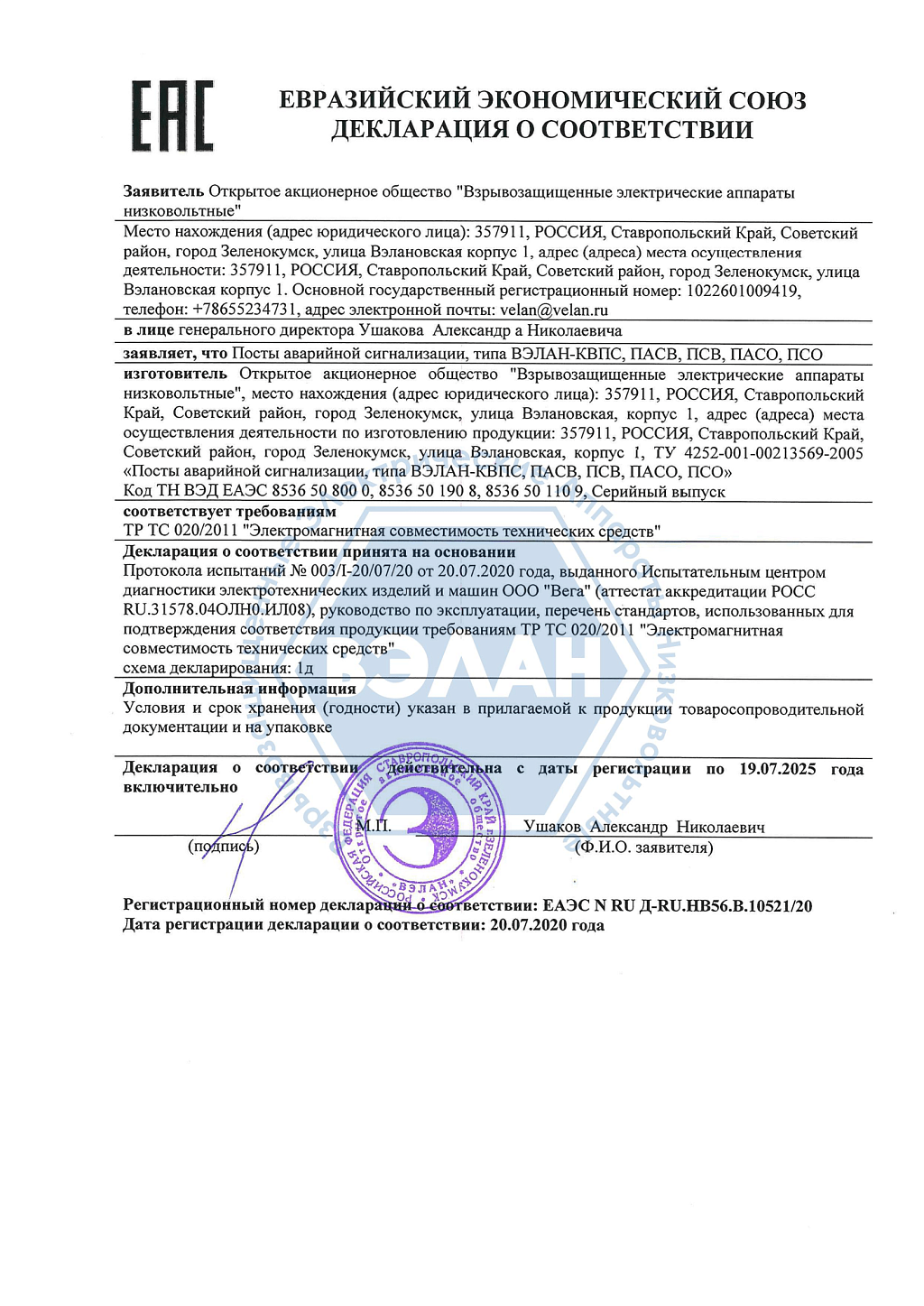 Пост ПАСВ1-П-75-1Ж1К В1 аварийной сигнализации взрывозащищенный Вэлан купить в Челябинске в компании ВИПАКС.