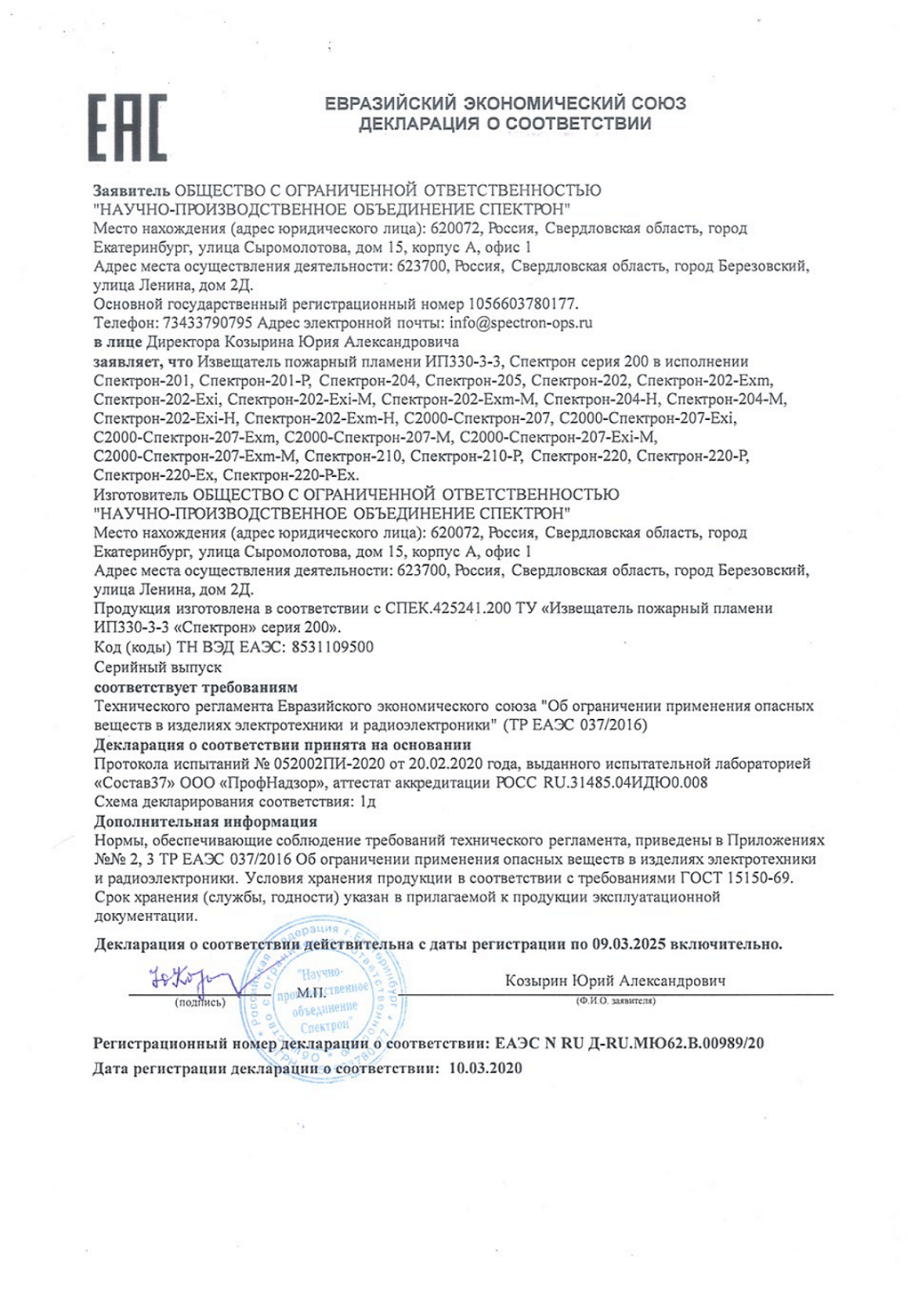 Сертификат соответствия Извещатель С2000-Спектрон-207 BOLID